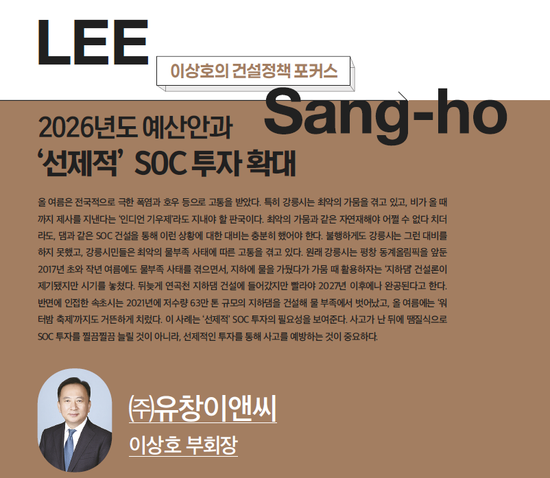 국내 경기 회복을 통한 경제 성장, 국민 복지 향상, 국가 경쟁력 제고뿐만 아니라 기후변화 대응을 위해서도 ‘선제적’ SOC 투자 확대가 필요하다. 사후약방문식 SOC 투자로는 당면한 문제 해결도 어렵다. 정부의 내년도 SOC 투자를 위한 예산안이 연말 국회 심의과정에서 좀 더 전향적으로 검토되기를 기대해 본다.