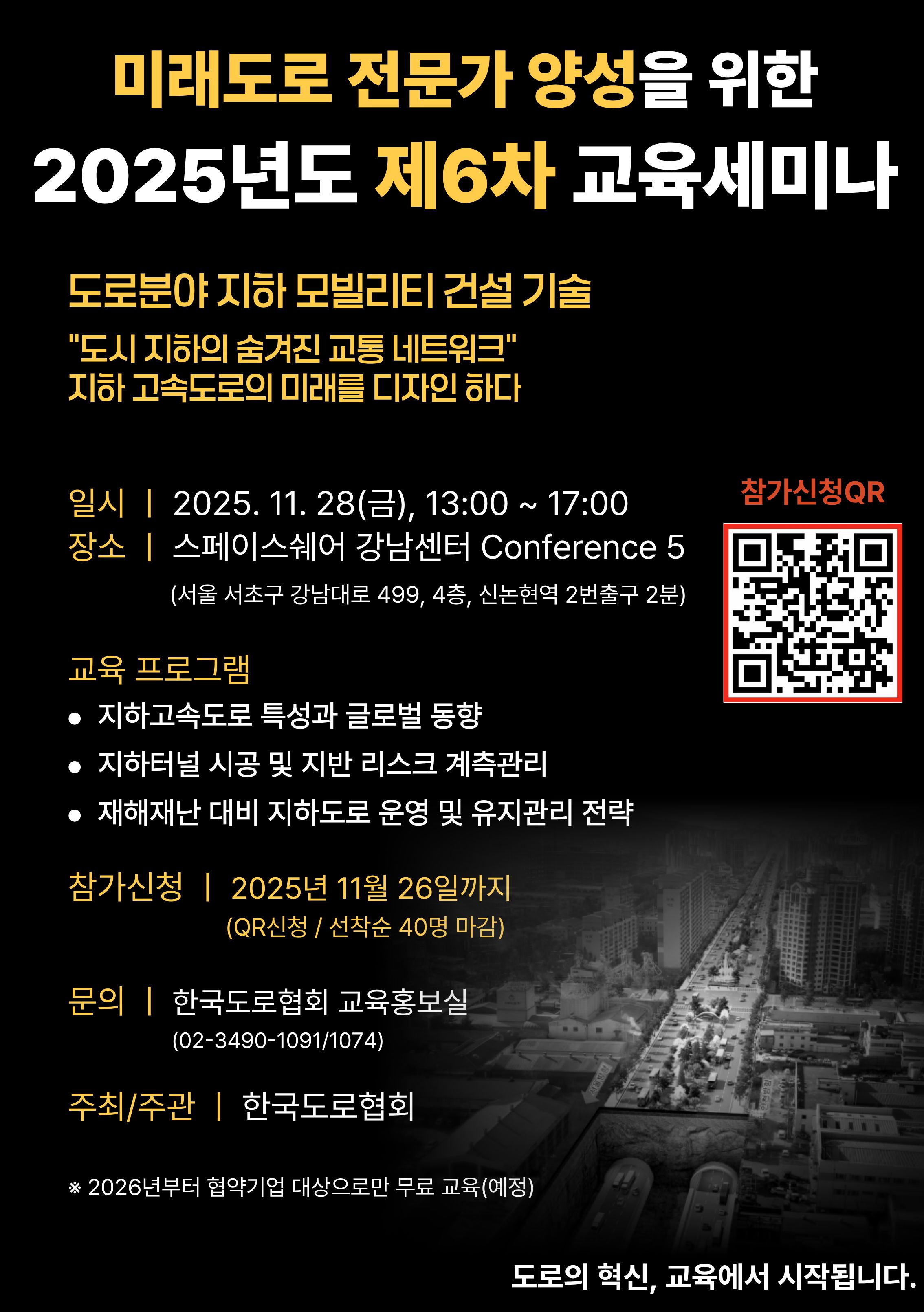 우리 협회에서는 지하도로 이해도를 높이고, 회원사의 업무역량을 강화하기 위해 2025년도 제6차 교육세미나를 개최합니다.