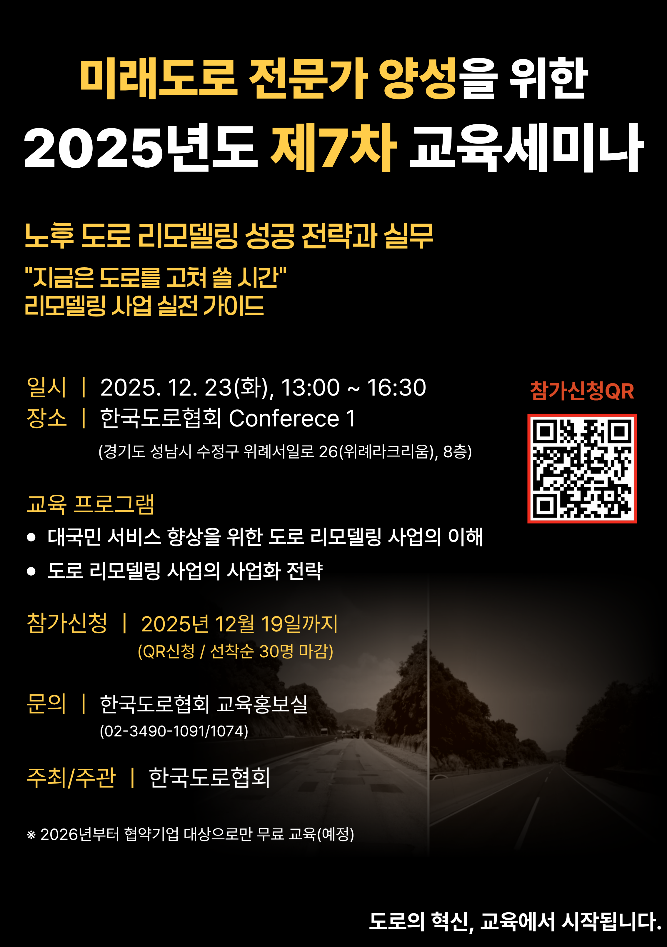 우리 협회에서는 노후도로 리모델링 사업 이해도를 높이고, 회원사의 업무역량을 강화하기 위해 2025년도 제7차 교육세미나를 개최합니다.